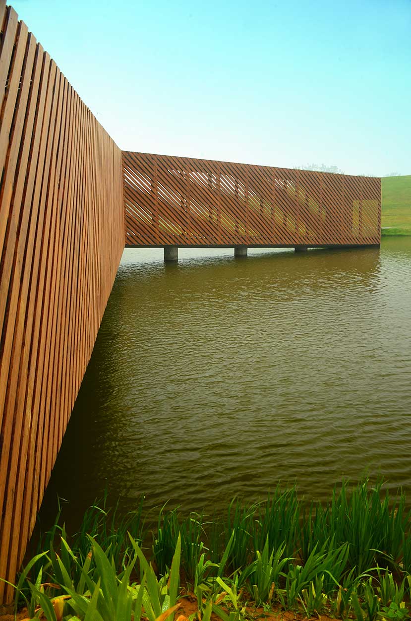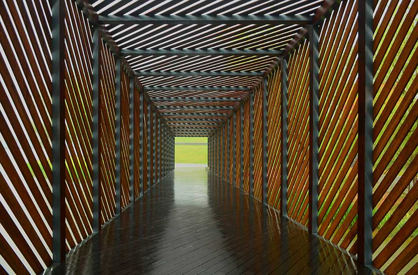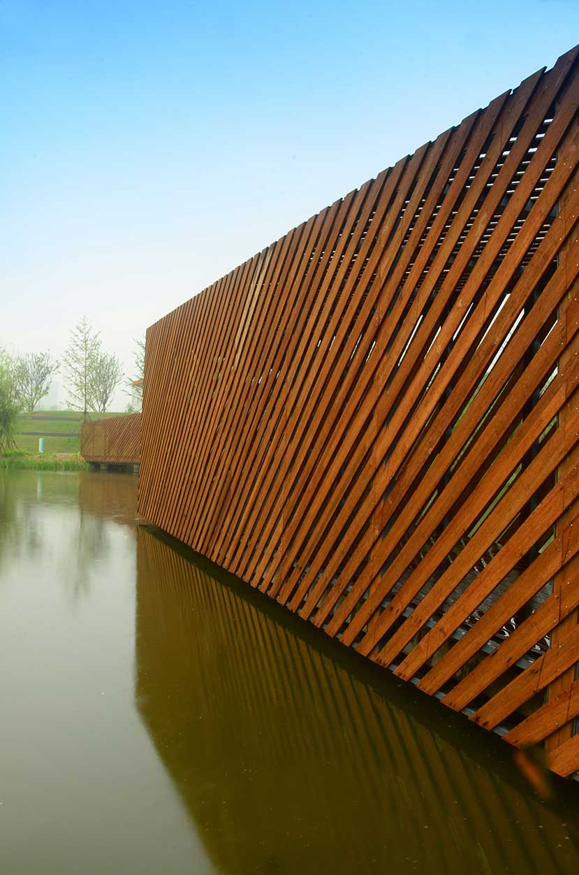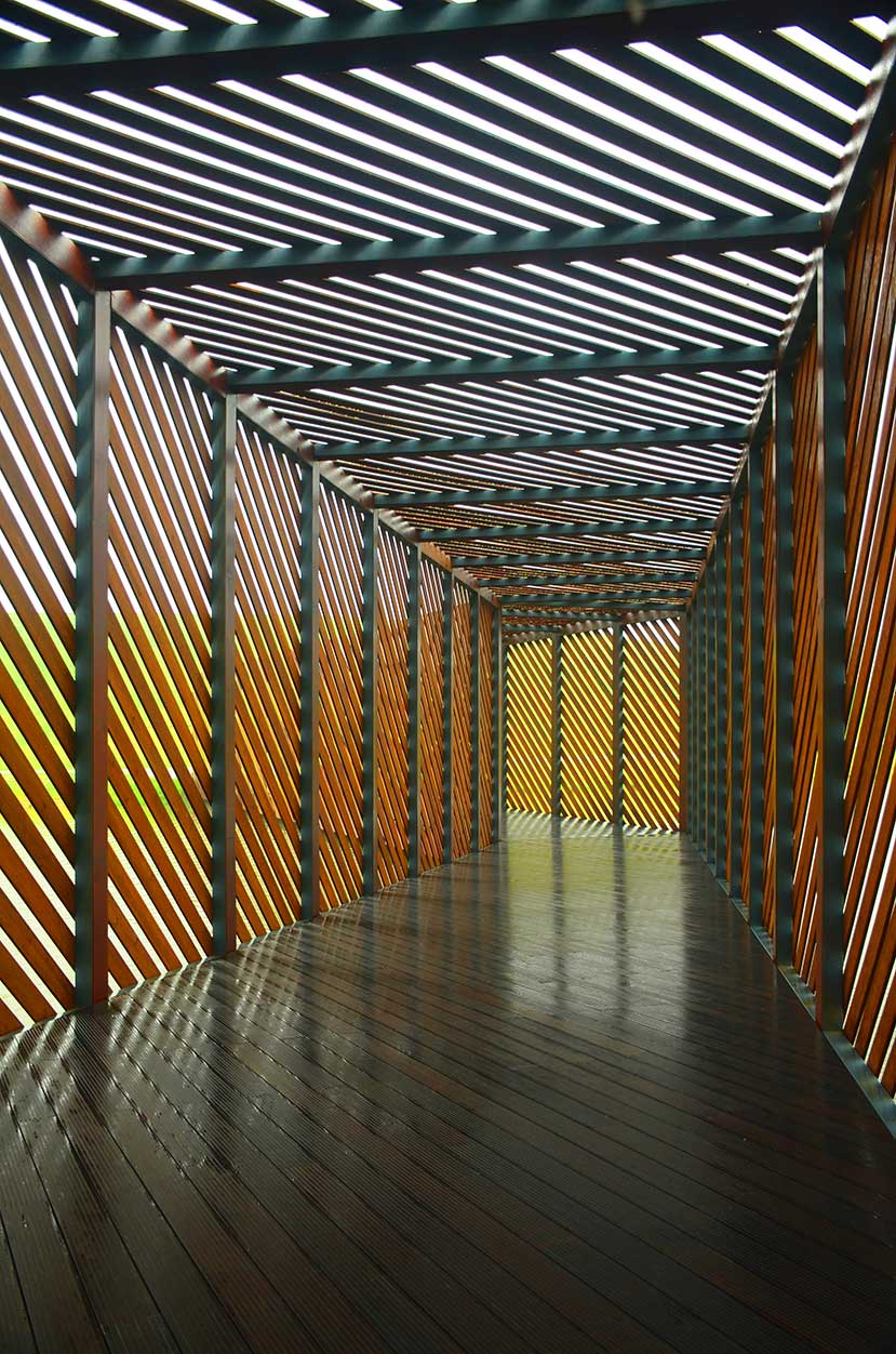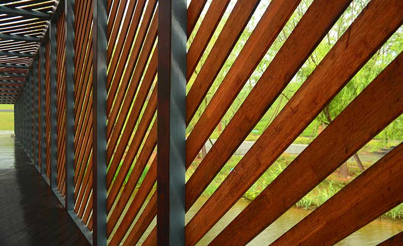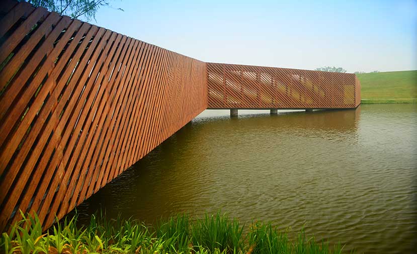 該景觀橋位于鄭州正弘中央公園內(nèi),主體為鋼架結(jié)構(gòu),運用桃花江戶外高炭防腐竹地板與淺炭格柵進(jìn)行造型與裝飾。景觀橋設(shè)計干練、簡約,直線條與斜線條有力的勾勒與極具親和力的戶外竹材表達(dá)使得景觀橋極具北歐風(fēng)情,成為公園內(nèi)的景觀核心。