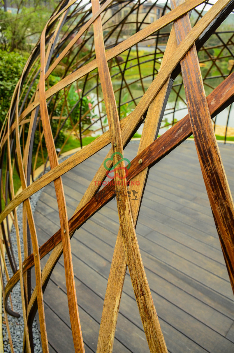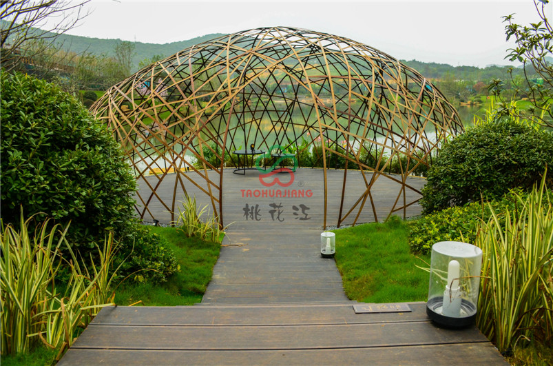 新城源山是南京新城在4A級(jí)景區(qū)-寶華山國(guó)家森林公園北門以東打造的山居純墅作品,項(xiàng)目?jī)?nèi)的綠化景觀道路鋪設(shè)了桃花江竹材科技的戶外高耐防腐竹地板,最值一提的是景觀湖中央及周邊的球形設(shè)計(jì),材料均是由桃花江竹材科技的碳化竹片編制成而成,頗具時(shí)尚藝術(shù)氣息,寧可食無肉,不可居無竹,竹材的加入更加浸潤(rùn)著山水韻致與佛家禪意,仿若身處仙境,更寄托著現(xiàn)代都市人山湖情結(jié)的悠哉生活方式。