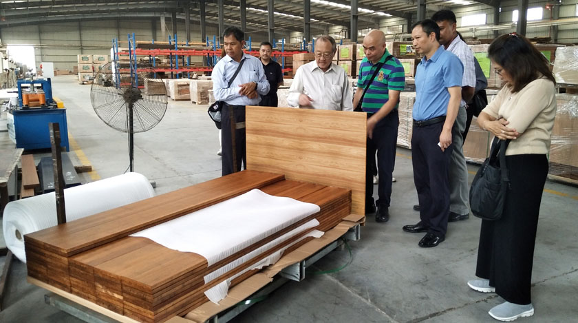 索枚先生一行在桃花江竹材科技的生產(chǎn)車間,詳細(xì)了解公司重組竹材的生產(chǎn)、銷售情況,得知我司的高炭防腐竹材的高科技和高性能后,索枚感嘆到“沒想到竹業(yè)在你們這里做得非常好,也讓我們學(xué)到了很多東西;我們將學(xué)到的帶到泰國去發(fā)展,推動我們國家竹產(chǎn)業(yè)的發(fā)展。”