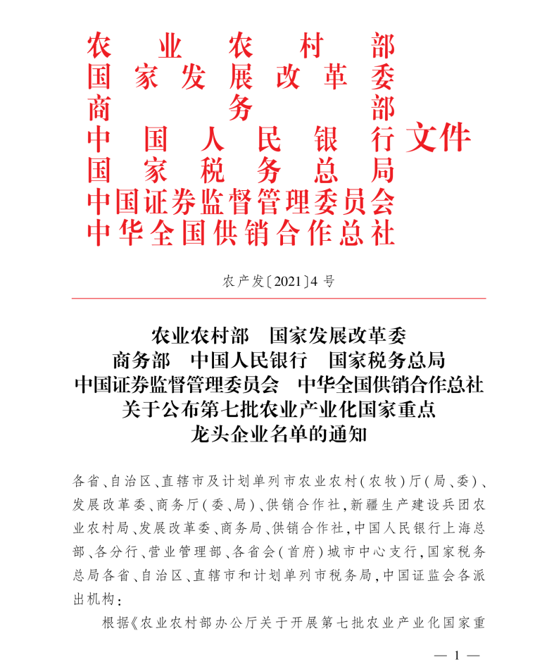 第七批農(nóng)業(yè)產(chǎn)業(yè)化國家重點(diǎn)龍頭企業(yè)認(rèn)定工作開始于2021年5月,由農(nóng)業(yè)農(nóng)村部會(huì)同國家發(fā)展改革委、商務(wù)部、中國人民銀行、國家稅務(wù)總局、中國證券監(jiān)督管理委員會(huì)、中華全國供銷合作總社組織開展。經(jīng)各?。▍^(qū)、市)遴選推薦、農(nóng)業(yè)農(nóng)村部組織專家評審、全國農(nóng)業(yè)產(chǎn)業(yè)化聯(lián)席會(huì)議審議、公示,決定,全國412家企業(yè)被認(rèn)定為農(nóng)業(yè)產(chǎn)業(yè)化國家重點(diǎn)龍頭企業(yè)。湖南桃花江竹材的正式獲批實(shí)現(xiàn)了桃江縣“零”國家級龍頭企業(yè)的突破。