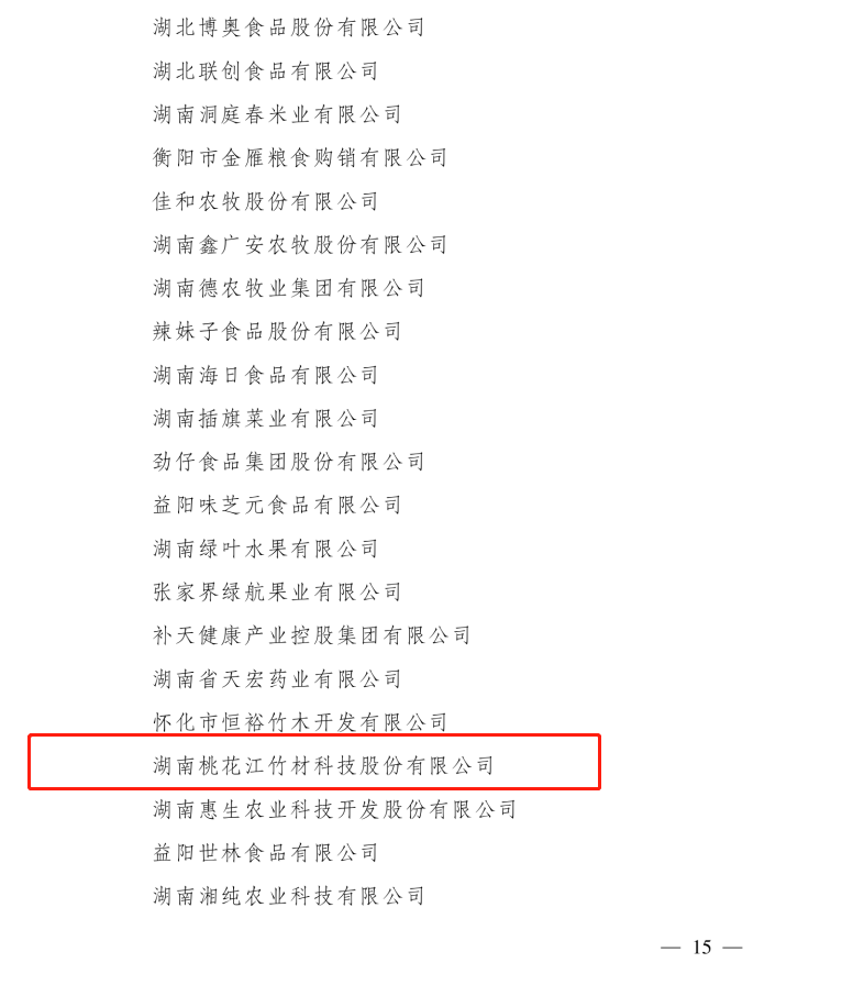 2021年12月30日公布的第七批農(nóng)業(yè)產(chǎn)業(yè)化國家重點(diǎn)龍頭企業(yè)名單中,湖南桃花江竹材科技股份有限公司成功入選。
