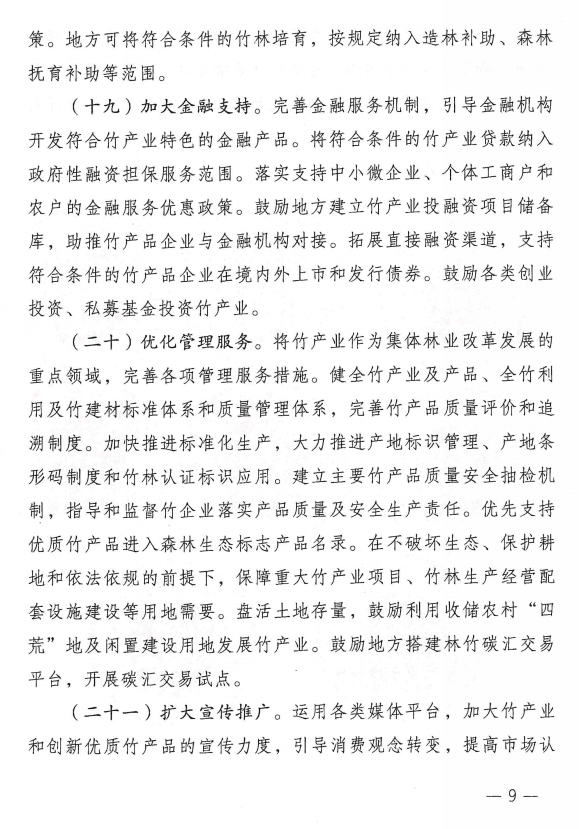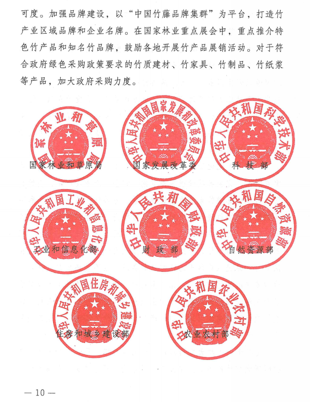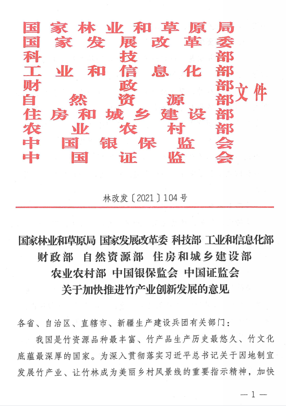 近日,國家林業(yè)和草原局、國家發(fā)展改革委、科技部、工業(yè)和信息化部、財政部、自然資源部、住房和城鄉(xiāng)建設部、農業(yè)農村部、中國銀保監(jiān)會、中國證監(jiān)會等10部門聯(lián)合發(fā)布了《關于加快推進竹產業(yè)創(chuàng)新發(fā)展的意見》(以下簡稱《意見》)。