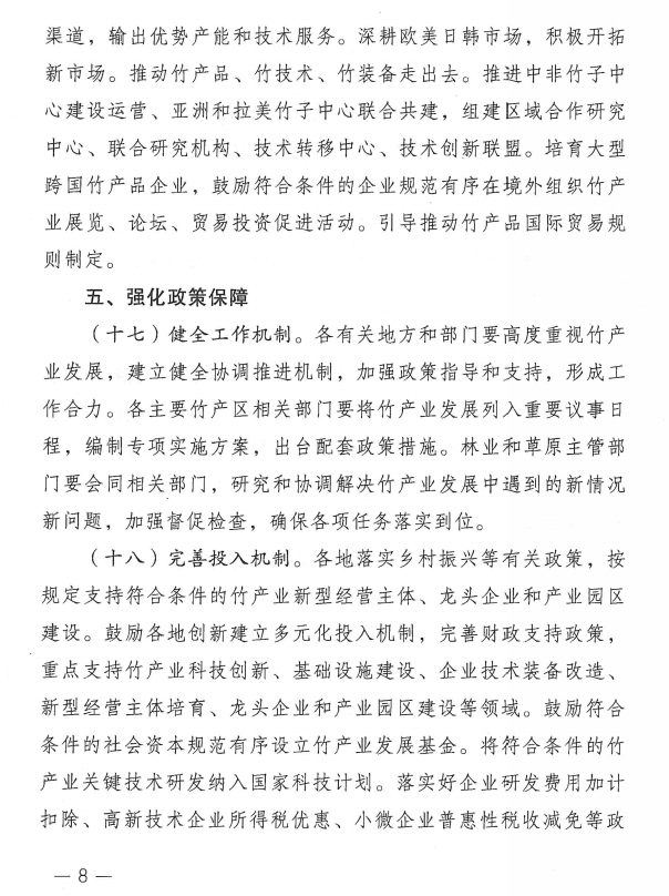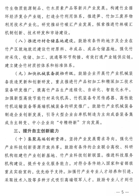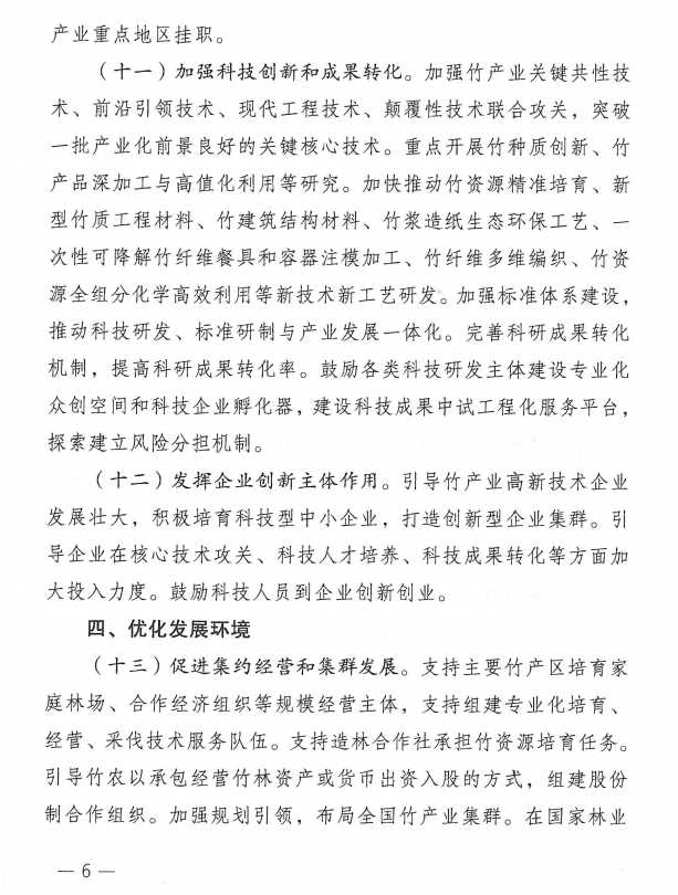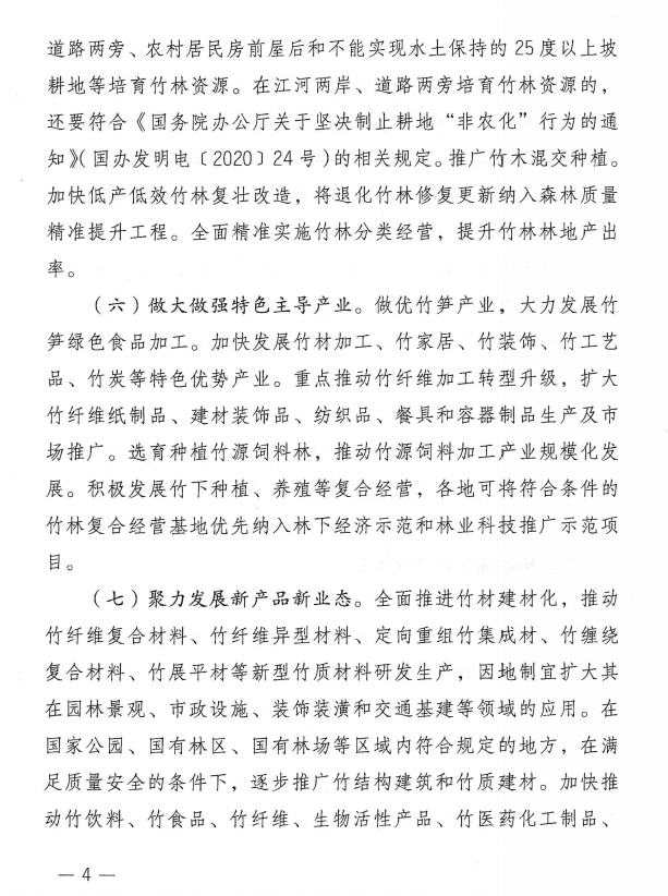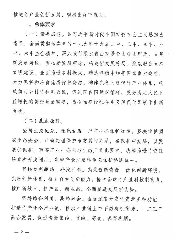 《意見》明確了竹產業(yè)創(chuàng)新發(fā)展的基本原則,要堅持生態(tài)優(yōu)先,綠色發(fā)展;堅持創(chuàng)新驅動,科技引領;堅持綜合利用,集約融合;堅持規(guī)劃先行,規(guī)范用地;堅持市場主導,政府引導。