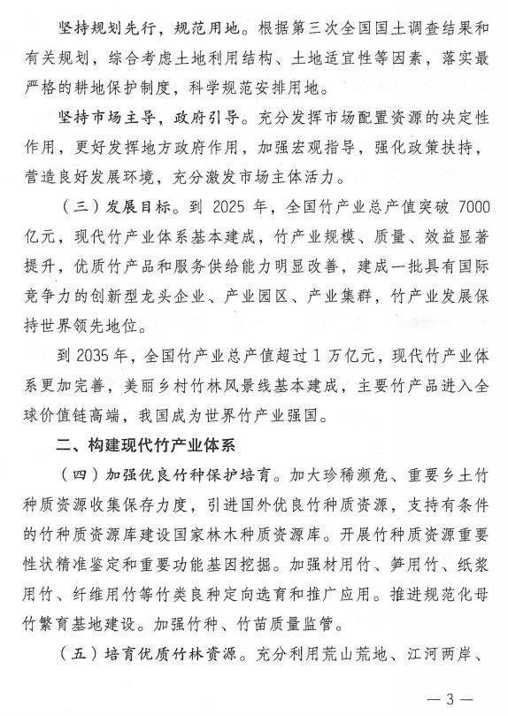 《意見》提出了發(fā)展目標,到2025年,全國竹產業(yè)總產值突破7000億元,現(xiàn)代竹產業(yè)體系基本建成,竹產業(yè)規(guī)模、質量、效益顯著提升,優(yōu)質竹產品和服務供給能力明顯改善,建成一批具有國際競爭力的創(chuàng)新型龍頭企業(yè)、產業(yè)園區(qū)、產業(yè)集群,竹產業(yè)發(fā)展保持世界領先地位;到2035年,全國竹產業(yè)總產值超過1萬億元,現(xiàn)代竹產業(yè)體系更加完善,美麗鄉(xiāng)村竹林風景線基本建成,主要竹產品進入全球價值鏈高端,我國成為世界竹產業(yè)強國。